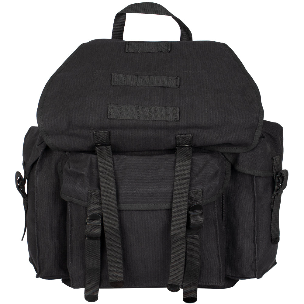 Our NATO Style Rucksack is a replica of the European NATO Rucksack, a great bag for work, school or just for day-to-day.It features a large main compartment with drawstring closure under a storm flap, an inside pocket with a hook and loop closure, a large front exterior pocket, and two side pockets. It also has modular attachment points on the storm flap and Polypro webbing throughout.